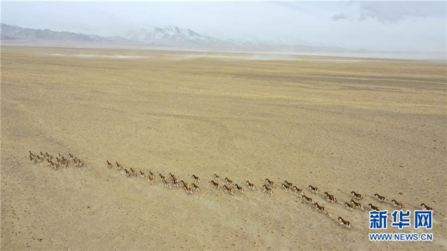 藏野驢奔跑在阿爾金山國家級自然保護(hù)區(qū)內(nèi)(3月31日無人機(jī)拍攝)。 新華社記者 胡虎虎 攝