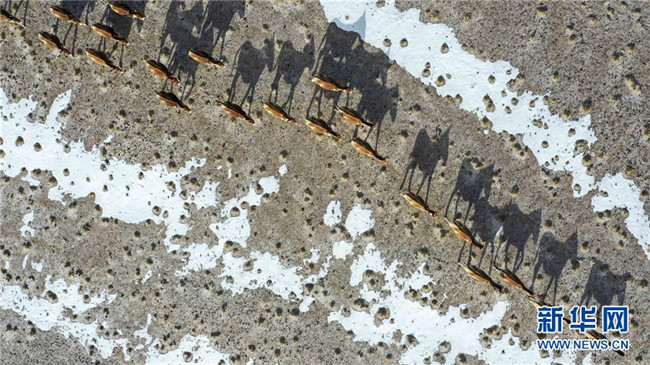 阿爾金山國家級自然保護(hù)區(qū)內(nèi)的藏野驢(4月2日無人機(jī)拍攝)。 新華社記者 胡虎虎 攝