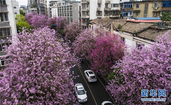 4月14日,在廣西柳州市彎塘路,車輛在開滿洋紫荊的街道上行駛(無人機拍攝)。