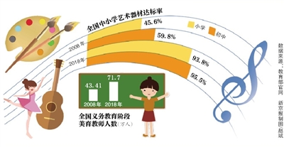 根據(jù)教育部公布的最新數(shù)據(jù),2018年全國小學藝術(shù)器材達標率提高到93.8%,初中提高到95.5%;2018年全國義務教育階段美育教師人數(shù)增加到71.7萬人。比10年前有較大幅度提高。