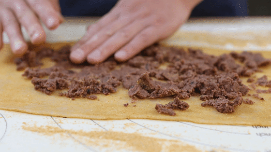 17.將紅豆餡均勻的抹在糯米面片上。(紅豆沙不能太干,太干不太好卷,也不能太稀,太稀用刀一切就流出來(lái)了。如果能買(mǎi)的高品質(zhì)的紅豆沙最好,做驢打滾紅豆沙是非常重要的,如果買(mǎi)不到口感好的紅豆沙,建議你在家自己做。)
