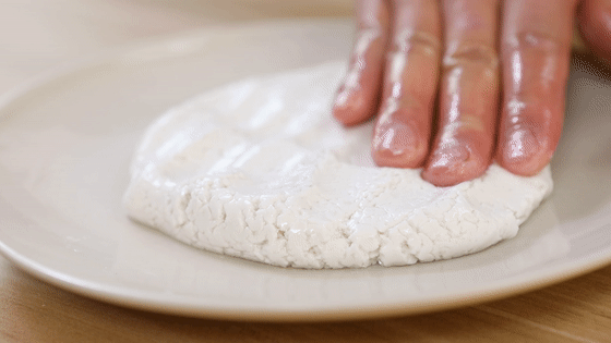 9.待其均勻吸收水分后,將結(jié)塊的糯米粉團(tuán)揉成光滑的面團(tuán)。