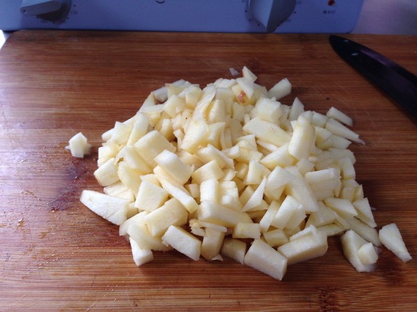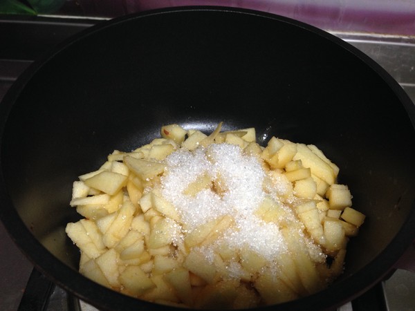 6.倒入少許水淀粉收汁冷卻備用,加入水淀粉可以讓蘋果丁口感會(huì)更綿滑