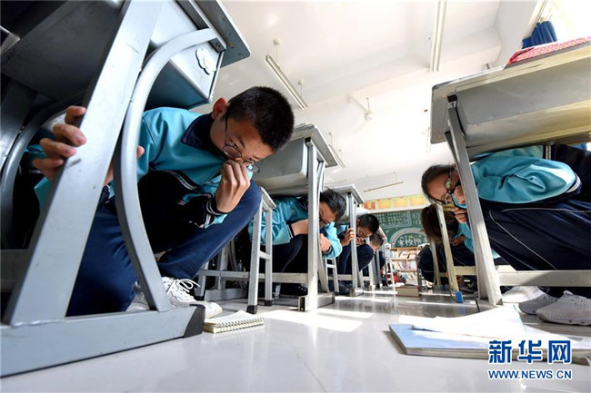 5月12日,邢臺市第八中學(xué)學(xué)生在進行模擬防震減災(zāi)演練。新華社記者 朱旭東 攝
