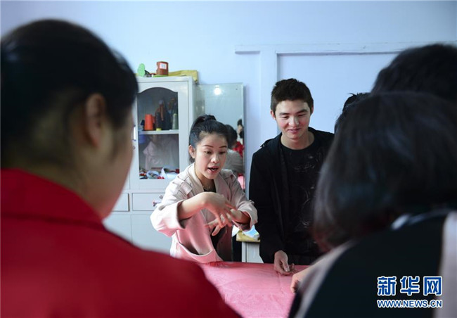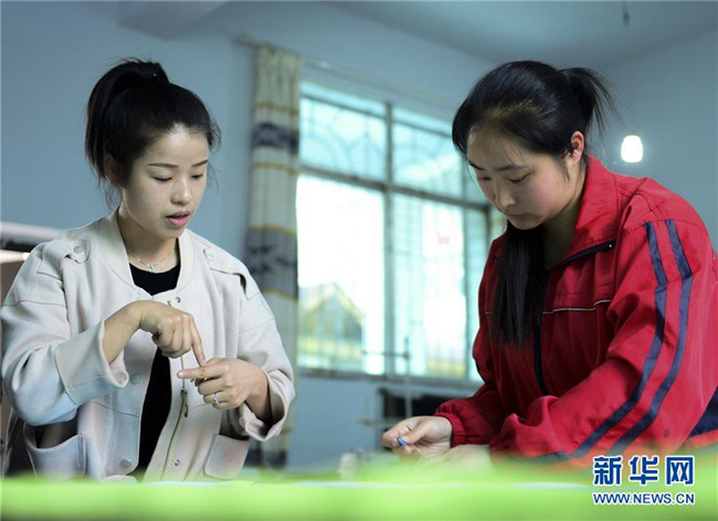 5月15日,在畢節(jié)市特殊教育學(xué)校,老師在用手語(yǔ)指導(dǎo)學(xué)生縫制床單。 新華社發(fā)(尚宇杰 攝)