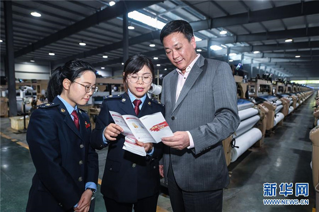 浙江省長興縣稅務部門工作人員在一家公司的車間內向企業(yè)負責人宣傳減稅降費政策(4月16日攝)。新華社記者 徐昱 攝