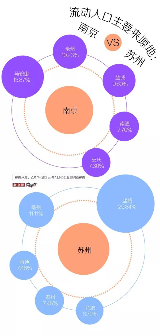 根據(jù) 2017 年全國流動(dòng)人口動(dòng)態(tài)監(jiān)測調(diào)查數(shù)據(jù),南京流動(dòng)人口的第一來源地是馬鞍山,前五大來源地中有三個(gè)是安徽的城市;蘇州流動(dòng)人口的第一來源地是鹽城,前五大來源地本省占了三個(gè)。