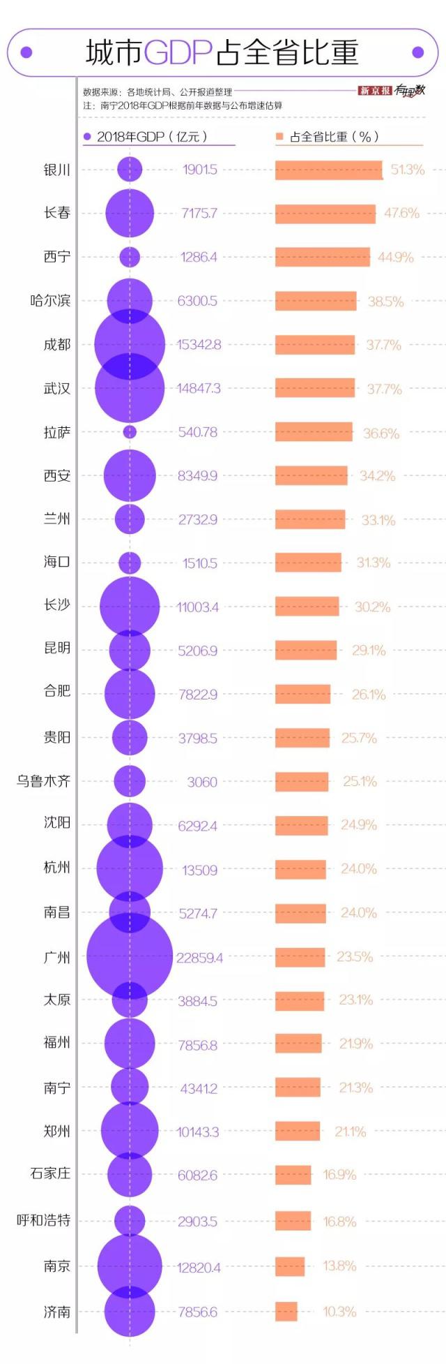 我們梳理了 27 個(gè)省和自治區(qū) 2018 年的地區(qū)生產(chǎn)總值后發(fā)現(xiàn),目前西藏、青海、寧夏、海南、甘肅五地 GDP 未破萬億,所以相應(yīng)的拉薩、西寧、銀川、???、蘭州留給大家的記憶點(diǎn)可能不多;而像江蘇、山東兩地 GDP 可以排在全國前十,但其省會(huì)城市南京、濟(jì)南的 GDP 占全省比重不到 15%。