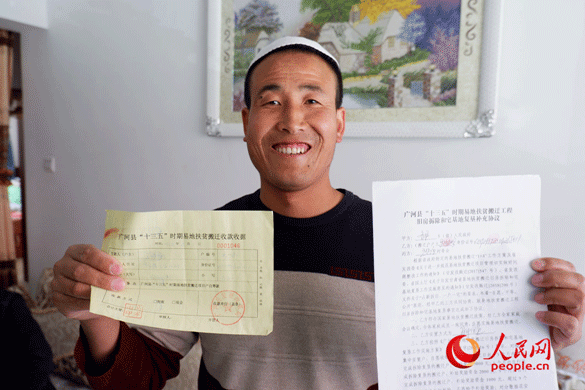 (馬沙力哈向記者展示他家的易地扶貧搬遷手續(xù)。人民網 張桂貴/攝)