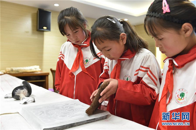 5月31日,學(xué)生們?cè)趯幭墓淘┪镳^體驗(yàn)拓印。新華社記者 唐亞蒙 攝
