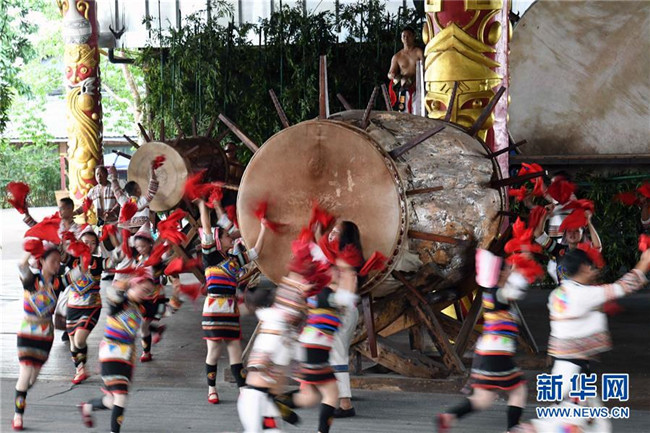 基諾族演員在表演大鼓舞(6月1日攝)。