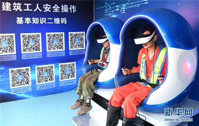 6月5日,重慶化龍橋超高層項(xiàng)目工人在VR安全體驗(yàn)館內(nèi)體驗(yàn)“高空墜落”。在VR安全體驗(yàn)館,工人們可通過VR游戲的方式親身體驗(yàn)高空墜落、消防事故處置等項(xiàng)目,了解施工過程中可能遇到的危險(xiǎn)、困難以及解決方法。 新華社記者 王全超 攝