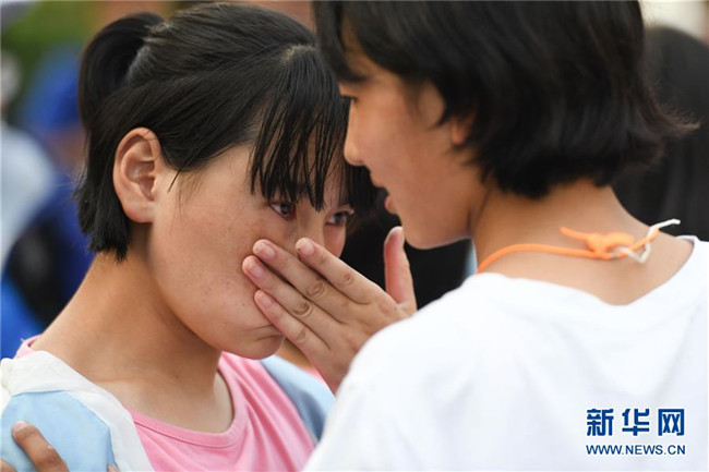 6月9日,合肥市第三十五中學西藏班的初三畢業(yè)生(右)與老師告別時落淚。