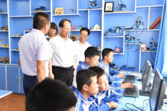 石泰峰十分關心農(nóng)村學校運用“互聯(lián)網(wǎng)+”破解師資力量和優(yōu)質(zhì)教育資源短缺問題。在西夏區(qū)鎮(zhèn)北堡鎮(zhèn)華西中學和賀蘭縣洪廣鎮(zhèn)金山小學,石泰峰走進科普活動室、錄播室和教師辦公室,了解視頻遠程教學和在線互動課堂開展情況。他說,“互聯(lián)網(wǎng)+教育”是促進教育公平的有效手段,要通過互聯(lián)網(wǎng)技術,一方面把區(qū)內(nèi)優(yōu)質(zhì)教育資源輸送到偏遠地區(qū)、農(nóng)村學校,一方面引進發(fā)達地區(qū)先進教育理念、教學技術、數(shù)字資源為我所用,提升教育教學水平。