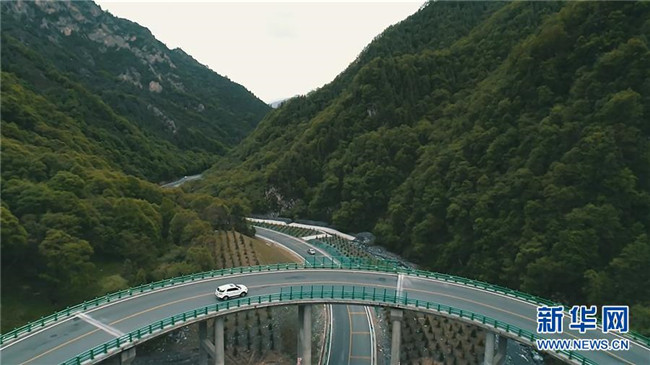6月11日,一輛汽車在青海省扎隆溝至碾伯鎮(zhèn)公路上行駛(無人機(jī)拍攝)。 新華社記者 張宏祥 攝