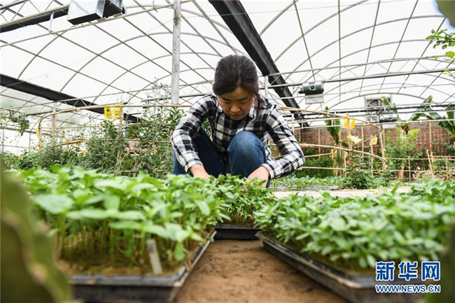 5月7日,在庫(kù)布其沙漠恩格貝生態(tài)示范區(qū)內(nèi),一名農(nóng)藝師整理培育的沙生植物苗。 新華社記者 劉磊 攝