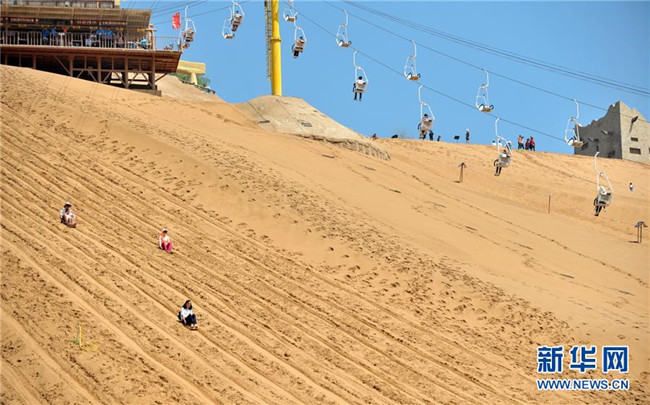 游客在寧夏中衛(wèi)市沙坡頭旅游景區(qū)游玩。沙坡頭旅游景區(qū)因地制宜發(fā)展沙漠旅游,旺季日接待游客量達(dá)兩萬人次(2018年8月22日攝)。 新華社記者 劉軍喜 攝