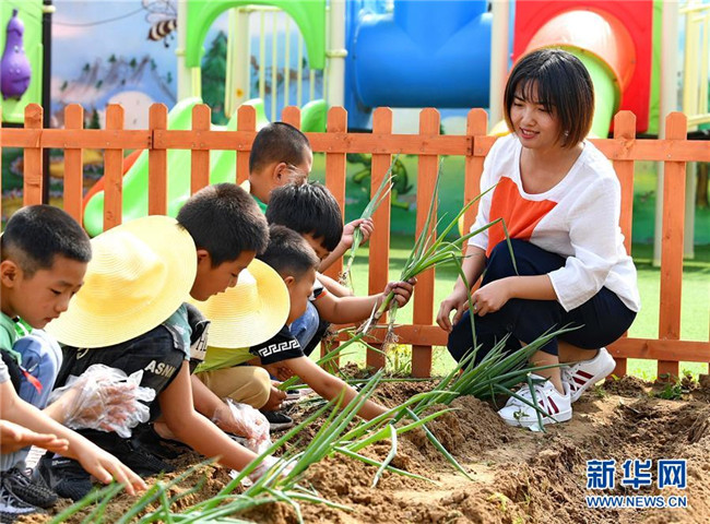 6月17日,樂亭縣大相各莊鄉(xiāng)幼兒園老師在勞動實踐基地的小菜園里教孩子們栽種大蔥。新華社記者楊世堯攝