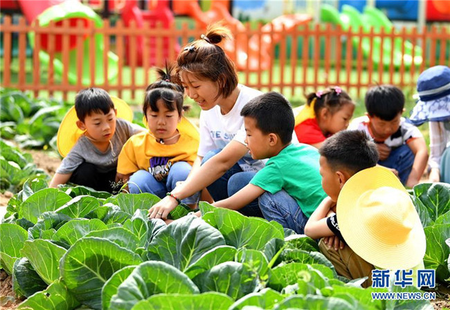 6月17日,樂亭縣大相各莊鄉(xiāng)幼兒園老師在勞動實踐基地的小菜園里給孩子們講解甘藍菜的生長過程。新華社記者楊世堯攝