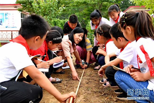 6月17日,樂亭縣汀流河鎮(zhèn)楊各莊小學的老師在校園勞動實踐基地內為學生講解土地丈量知識。新華社記者楊世堯攝