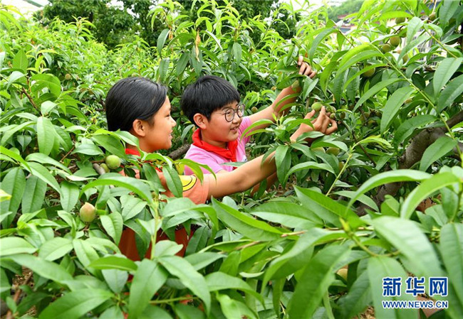 6月17日,樂亭縣毛莊鎮(zhèn)松各莊小學的學生在校園勞動實踐基地果園內觀察桃子的長勢。新華社記者楊世堯攝