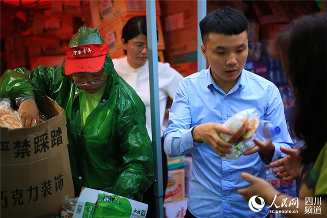 6月19日,宜賓長寧地震后的第二個清晨,安置點正在發(fā)放免費早餐。(人民網(wǎng) 朱虹 攝)