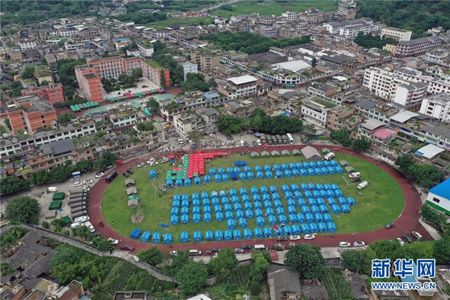 6月18日無人機(jī)拍攝的長寧縣雙河中學(xué)安置點(diǎn)。 新華社發(fā)(曾朗 攝)