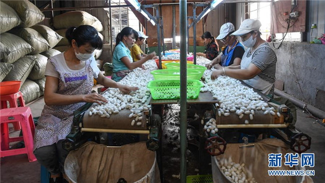6月18日,在廣西隆林縣輕工業(yè)園區(qū)一家繅絲廠,來(lái)自易地扶貧搬遷安置點(diǎn)的群眾在“扶貧車間”篩選蠶繭。