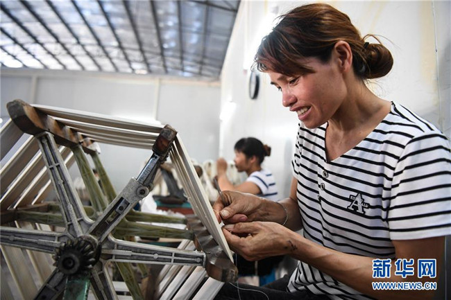 6月18日,在廣西隆林縣輕工業(yè)園區(qū)一家繅絲廠,來(lái)自易地扶貧搬遷安置點(diǎn)的群眾在“扶貧車間”紡紗。