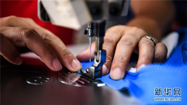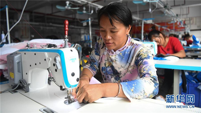 6月18日,在廣西隆林縣輕工業(yè)園區(qū)一家服裝廠,來(lái)自易地扶貧搬遷安置點(diǎn)的一名婦女在“扶貧車間”縫制衣服。