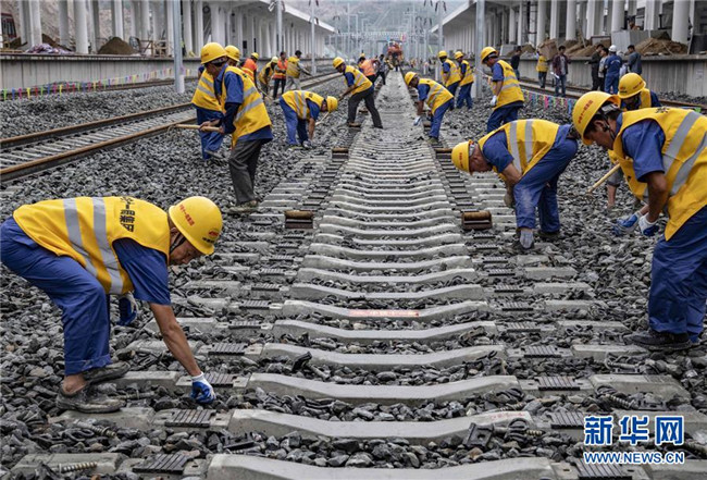 6月22日,中鐵十一局三公司職工在湖北省十堰市十堰北站為漢十高鐵最后一組500米長軌鋪設(shè)做準(zhǔn)備。新華社記者 杜華舉 攝