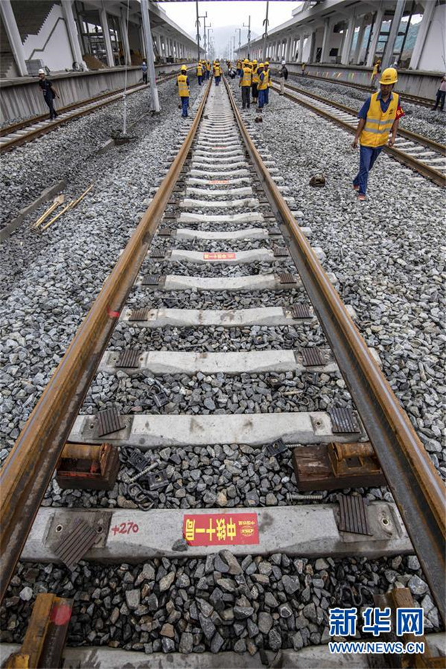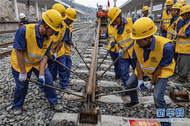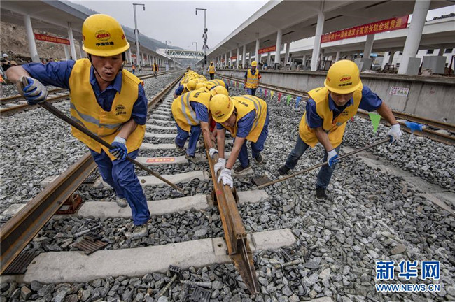 6月22日,中鐵十一局三公司職工在湖北省十堰市十堰北站鋪設(shè)漢十高鐵最后一組500米長軌。新華社記者 杜華舉 攝