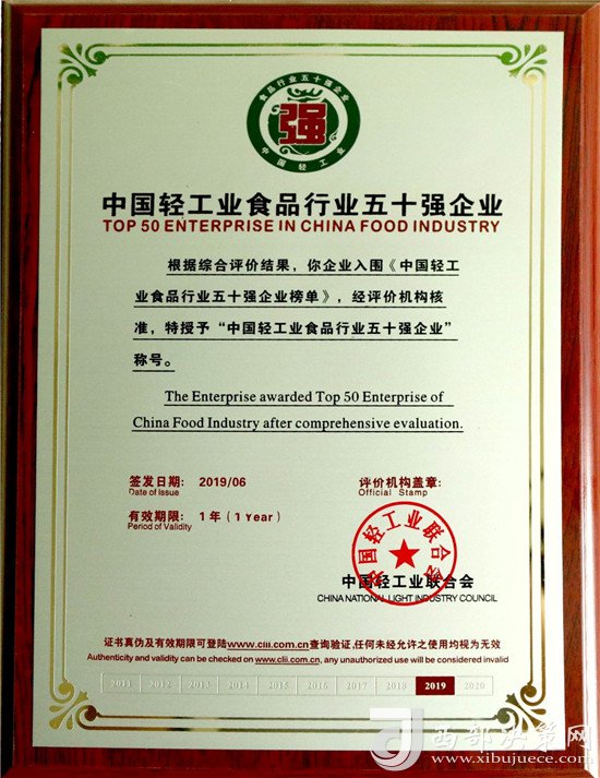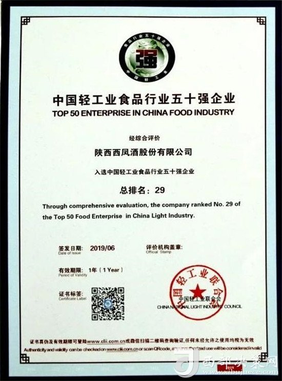 近日,由中國(guó)輕工業(yè)聯(lián)合會(huì)主辦,主題為“強(qiáng)化科技創(chuàng)新,服務(wù)美好生活”的“中國(guó)輕工業(yè)百?gòu)?qiáng)企業(yè)高峰論壇”在北京召開(kāi)。會(huì)上,中國(guó)輕工業(yè)聯(lián)合會(huì)公布了2018年度中國(guó)輕工業(yè)食品行業(yè)五十強(qiáng)企業(yè),西鳳股份公司憑借良好的發(fā)展業(yè)績(jī)、市場(chǎng)口碑、行業(yè)競(jìng)爭(zhēng)力及日益增強(qiáng)的品牌影響力,被中國(guó)輕工業(yè)聯(lián)合會(huì)授予“中國(guó)輕工業(yè)食品行業(yè)五十強(qiáng)企業(yè)”榮譽(yù)稱號(hào),并受到表彰獎(jiǎng)勵(lì)。