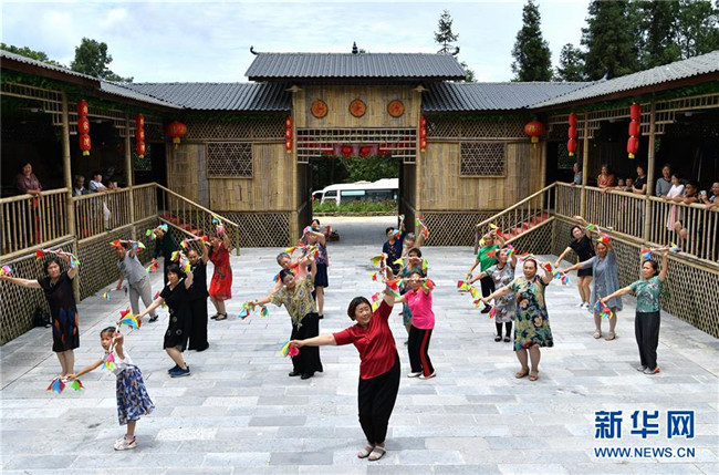 7月1日,游客在湖北省恩施土家族苗族自治州宣恩縣珠山鎮(zhèn)車洞坪民宿旅游區(qū)體驗(yàn)土家族“八寶銅鈴舞”。 新華社發(fā)(宋文 攝)