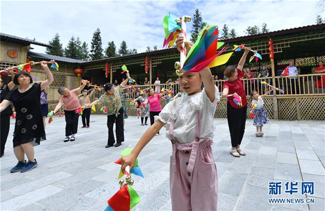 7月1日,游客在湖北省恩施土家族苗族自治州宣恩縣珠山鎮(zhèn)車洞坪民宿旅游區(qū)體驗(yàn)土家族“八寶銅鈴舞”。新華社發(fā)(宋文 攝)