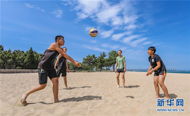 6月30日,人們?cè)谏綎|省榮成市桑溝灣海域的沙灘上玩沙灘排球。新華社發(fā)(李信君 攝)