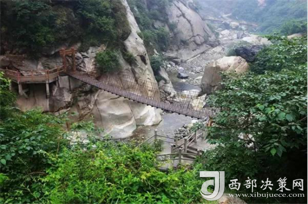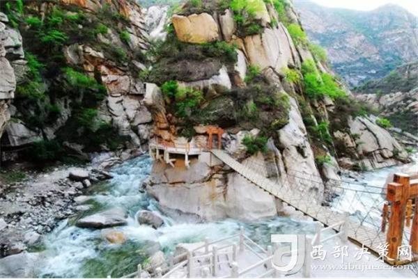 踏進峪口,頭頂是遮天蔽日的綠色,四周水聲潺潺,鳥鳴悅耳,空谷幽靈,沉靜自然,涼爽的山風夾雜著花草的芳香,瞬間就滋潤了燥熱的心情。迎著溪谷逆水而上,山的奇特與水的靈秀交織在一起,伴著水聲,綿延著向更遠處伸展。若有情致,卷起褲腿,或穿上沙灘鞋,或赤足,踏著被溪水長久沖刷平整光滑的大石頭,任由清涼通透的溪水撫摸雙足,沁心入骨,仿佛拾回了童年的歡樂,煩擾憂愁全無蹤影。臨水而筑的棧道,全程依水而行,曲徑通幽,每轉一道彎,都是一幅新景。