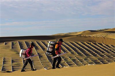 “沙袋內(nèi)只需充填干沙,平鋪于沙表面即完成了聚乳酸沙袋沙障的鋪設(shè)。同草方格等傳統(tǒng)沙障相比較,其鋪設(shè)效率可提高3至5倍、材料搬運量降低20至60倍。障體材料輕便,真正實現(xiàn)了‘以沙治沙’的科學(xué)理念。”虞毅說。