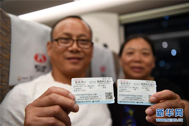 7月11日,乘坐G319次列車的乘客展示前往香港的車票。當(dāng)日,重慶至香港直達(dá)高鐵正式開通,此次首發(fā)的G319次復(fù)興號列車運(yùn)行速度350km/h,沿途經(jīng)停遵義、貴陽東、桂林西、肇慶東、廣州南和深圳北站。列車由重慶西站至香港西九龍站全程運(yùn)行需7小時37分鐘,全程票二等座票價為660元。目前內(nèi)地與香港聯(lián)通的高鐵車站已增加到58個。新華社記者唐奕攝