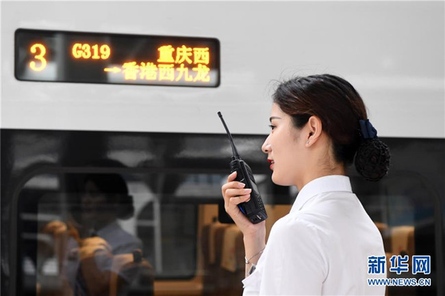7月11日,乘務(wù)員在G319次列車上做發(fā)車前的準(zhǔn)備工作。當(dāng)日,重慶至香港直達(dá)高鐵正式開通,此次首發(fā)的G319次復(fù)興號列車運(yùn)行速度350km/h,沿途經(jīng)停遵義、貴陽東、桂林西、肇慶東、廣州南和深圳北站。列車由重慶西站至香港西九龍站全程運(yùn)行需7小時37分鐘,全程票二等座票價為660元。目前內(nèi)地與香港聯(lián)通的高鐵車站已增加到58個。新華社記者唐奕攝
