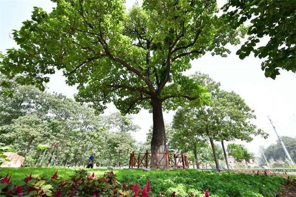 游客從蘭考焦裕祿干部學(xué)院門(mén)口的“焦桐”下走過(guò)(2017年8月9日攝)。這棵泡桐是焦裕祿當(dāng)年親手種下,被人們稱(chēng)為“焦桐”。
