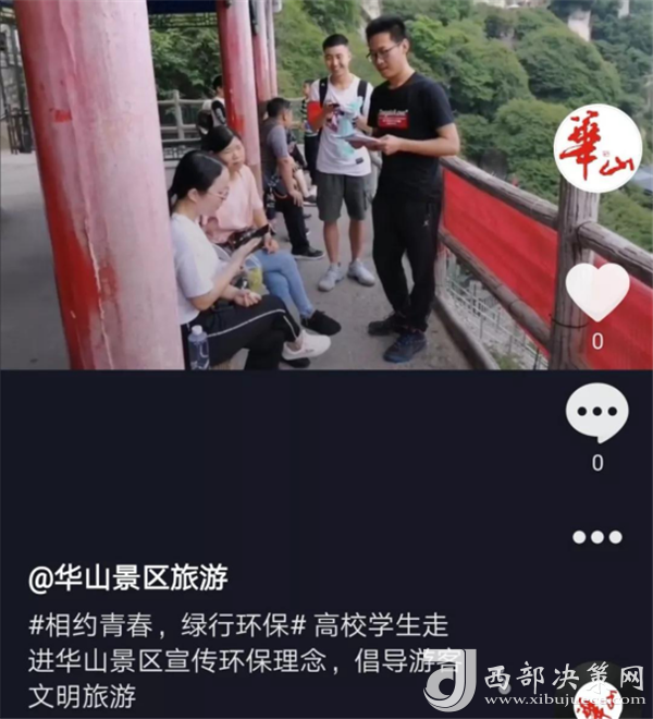 活動(dòng)還通過高校網(wǎng)絡(luò)紅人拍攝抖音“青春最美,華山見證”主題短視頻等傳播方式,在網(wǎng)絡(luò)線上形成熱度,為華山綠色環(huán)保游提供了新方式。