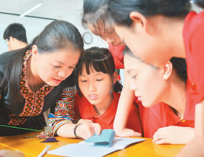 國家級非遺項目瑤族服飾傳承人李素芳(左一)指導營員編織瑤繡