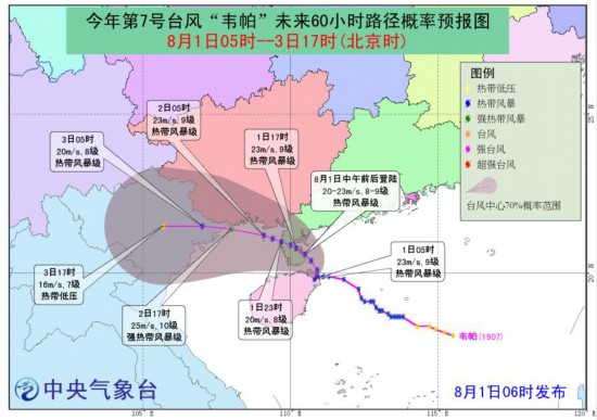 據(jù)中央氣象臺網(wǎng)站消息,中央氣象臺8月1日6時繼續(xù)發(fā)布臺風藍色預(yù)警,今年第7號臺風“韋帕”(熱帶風暴級)的中心今天凌晨1點50分前后在海南省文昌市沿海登陸。其中,廣東、廣西、福建、海南等地有大到暴雨。
