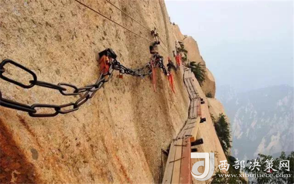在萬(wàn)仞絕壁上鑲嵌石釘搭木椽而筑,棧道上下皆是懸崖絕壁,鐵索橫懸,游人至此,面壁貼腹,屏氣挪步,被譽(yù)為“華山第一天險(xiǎn)”。