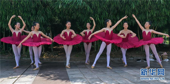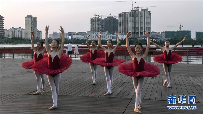 8月9日,芭蕾小天使們?cè)跉J州市夢(mèng)圓廣場(chǎng)排練節(jié)目。新華社記者 張愛林 攝
