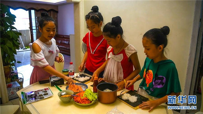 8月6日,芭蕾小天使們?cè)谕榧抑袑W(xué)做壽司(視頻截圖)。新華社記者 張愛林 攝