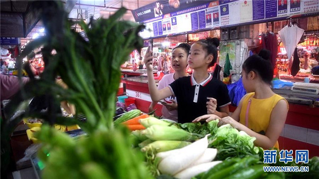 8月6日,芭蕾小天使們?cè)谑袌?chǎng)上買菜,幫助父母分擔(dān)家務(wù)活(視頻截圖)。新華社記者 張愛林 攝