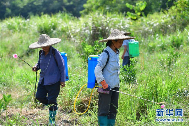 在廣西融安縣大良鎮(zhèn)古蘭村古蘭屯金桔種植基地,村民在田間管護(hù)金桔樹(shù)(8月18日攝)。 新華社記者 黃孝邦 攝