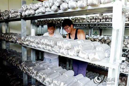 吳永振(右)檢查營(yíng)養(yǎng)袋接種生長(zhǎng)情況